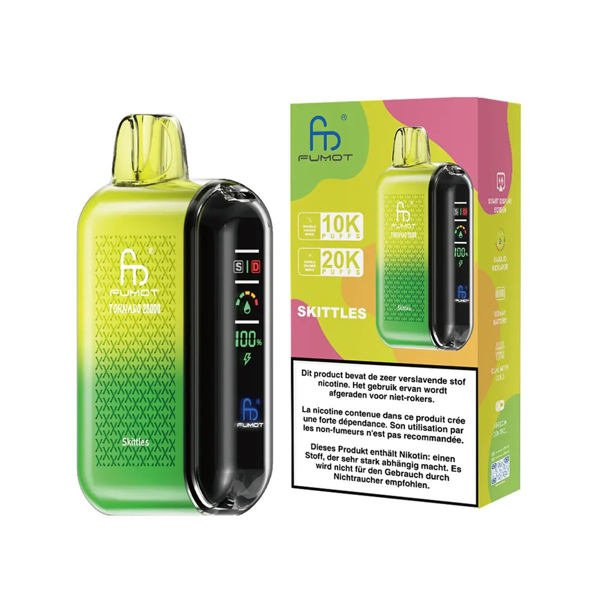 - Single-Engine-Modus: Sorgt für einen milderen, natürlicheren Geschmack. Jede RandM Tornado 20000 Skittles E-Zigarette bietet ca. 20000 Züge und ist dabei energie- und tanksparend.