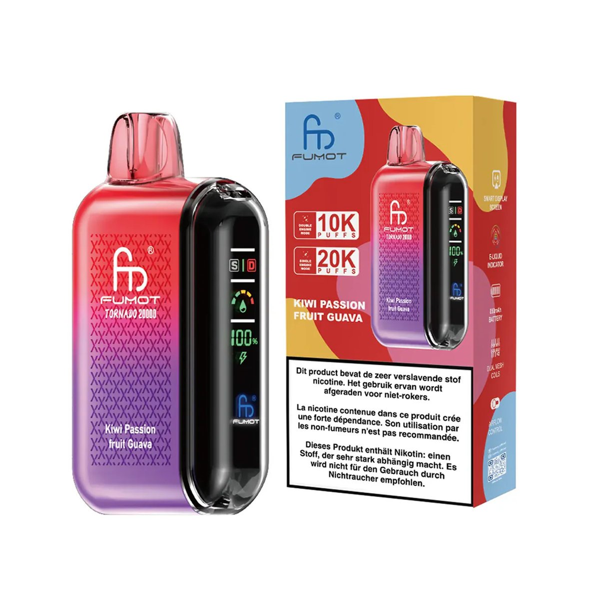 An einem perfekten Sommernachmittag sitzen Sie auf Ihrem Balkon oder genießen einen seltenen Moment der Entspannung im Freien. Die Kiwi Passionfruit Guava E-Zigarette Fumot Tornado 20K ist Ihr „tropischer Cocktail für unterwegs“.