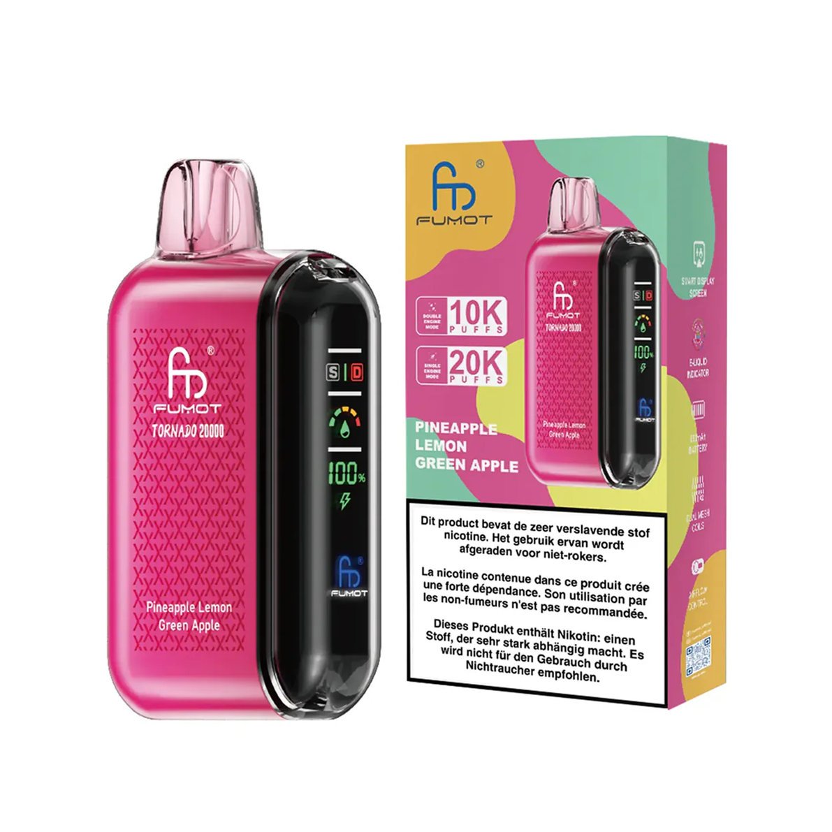 Die Einweg-E-Zigarette RandM Tornado 20000 Pineapple Lemon Green Apple verfügt über ein 20-ml-Liquid-Fassungsvermögen und einen wiederaufladbaren Akku für bis zu 20000 Züge. Das Gerät verfügt über eine integrierte LED-Anzeige zur Überwachung des Akku- und Liquid-Stands. Die RandM Tornado 20000 ist mit einer Dual-Mesh-Coil ausgestattet und bietet zwei Rauchmodi: Single-Modus und Dual-Modus. Im Single-Modus erzeugt das Gerät sanften und gleichmäßigen Rauch. Im Dualmodus bietet Ihnen der RandM 20000 Pineapple Lemon Green Apple einen reicheren Geschmack und dichteren Rauch, dies führt jedoch dazu, dass die E-Flüssigkeit schneller verbraucht wird, was die Gesamtzahl der Züge verringern kann.