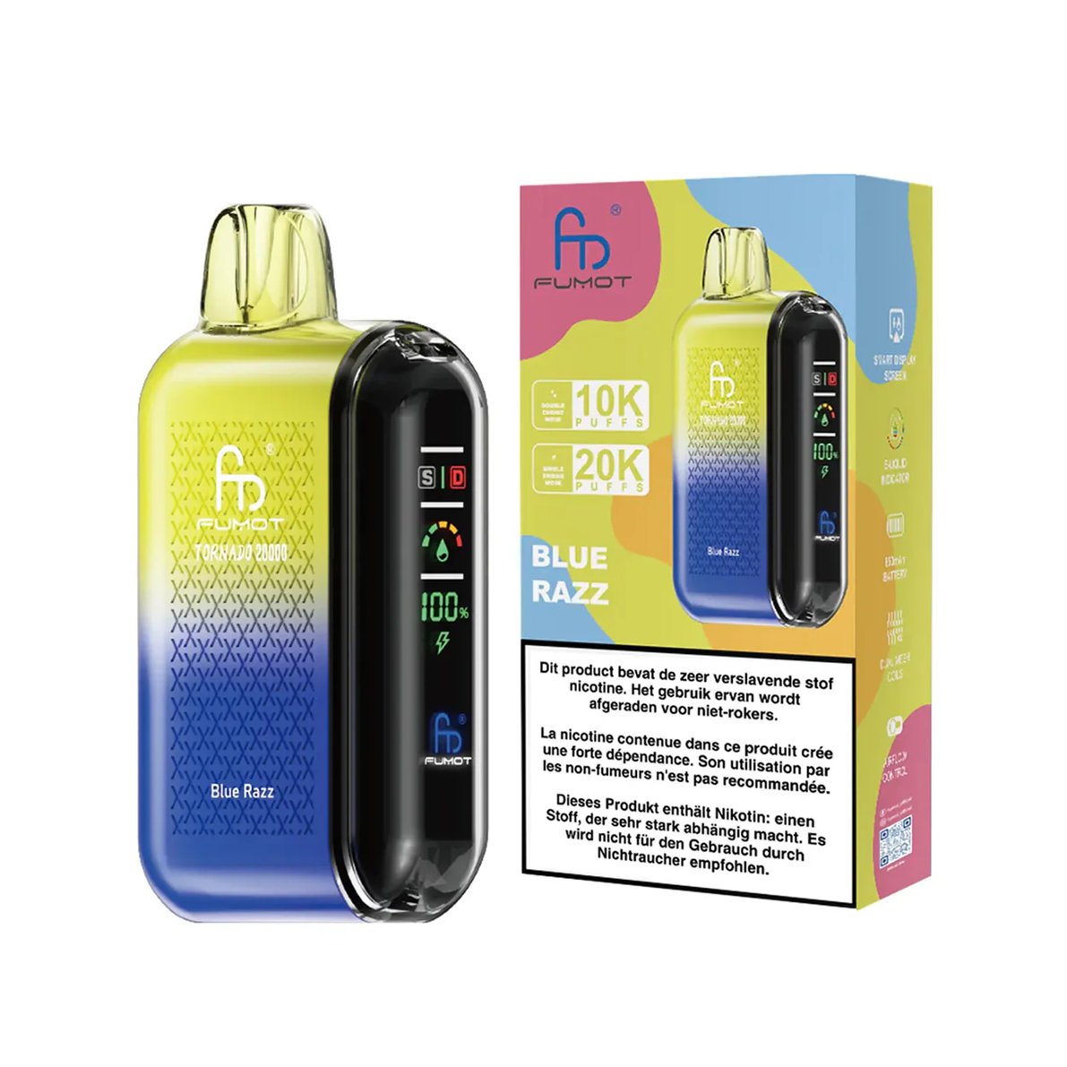 Die Einweg-E-Zigarette Tornado 20000 Blue Razz verfügt über ein 20-ml-Liquid-Fassungsvermögen und einen wiederaufladbaren Akku für bis zu 20000 Züge. Das Gerät verfügt über eine integrierte LED-Anzeige zur Überwachung des Akku- und Liquid-Stands. Die RandM Tornado 20000 ist mit einer Dual-Mesh-Coil ausgestattet und bietet zwei Rauchmodi: Single-Modus und Dual-Modus. Im Single-Modus erzeugt das Gerät sanften und gleichmäßigen Rauch. Im Dualmodus bietet Ihnen der Tornado 20000 Blue Razz einen reicheren Geschmack und dichteren Rauch, dies führt jedoch dazu, dass die E-Flüssigkeit schneller verbraucht wird, was die Gesamtzahl der Züge verringern kann.